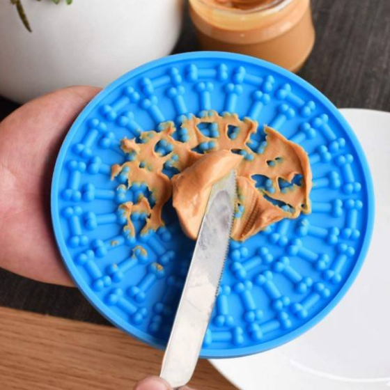 Measuring 5.9 inches in diameter, our Slow-Feeding Dog Mat works great to serve a heaping dollop of peanut butter or your dog’s favorite sticky snack as a stress-reducer in any wash or groom situation that would otherwise have him or her wandering around, distracted or anxious.